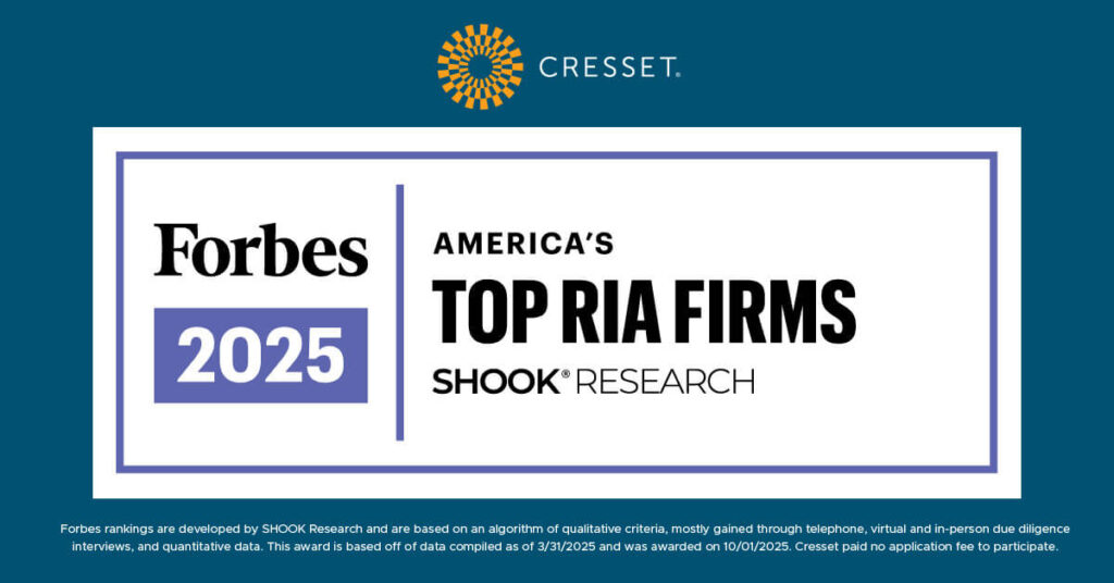 CHICAGO – Oct. 1, 2025 – Cresset rose to the #10 spot of 250 firms ranked on Forbes’ annual list of America’s Top RIA Firms, up from #14 in 2024. According to Forbes, the Top RIA list “highlights firms with proven records of safeguarding and growing client wealth.”